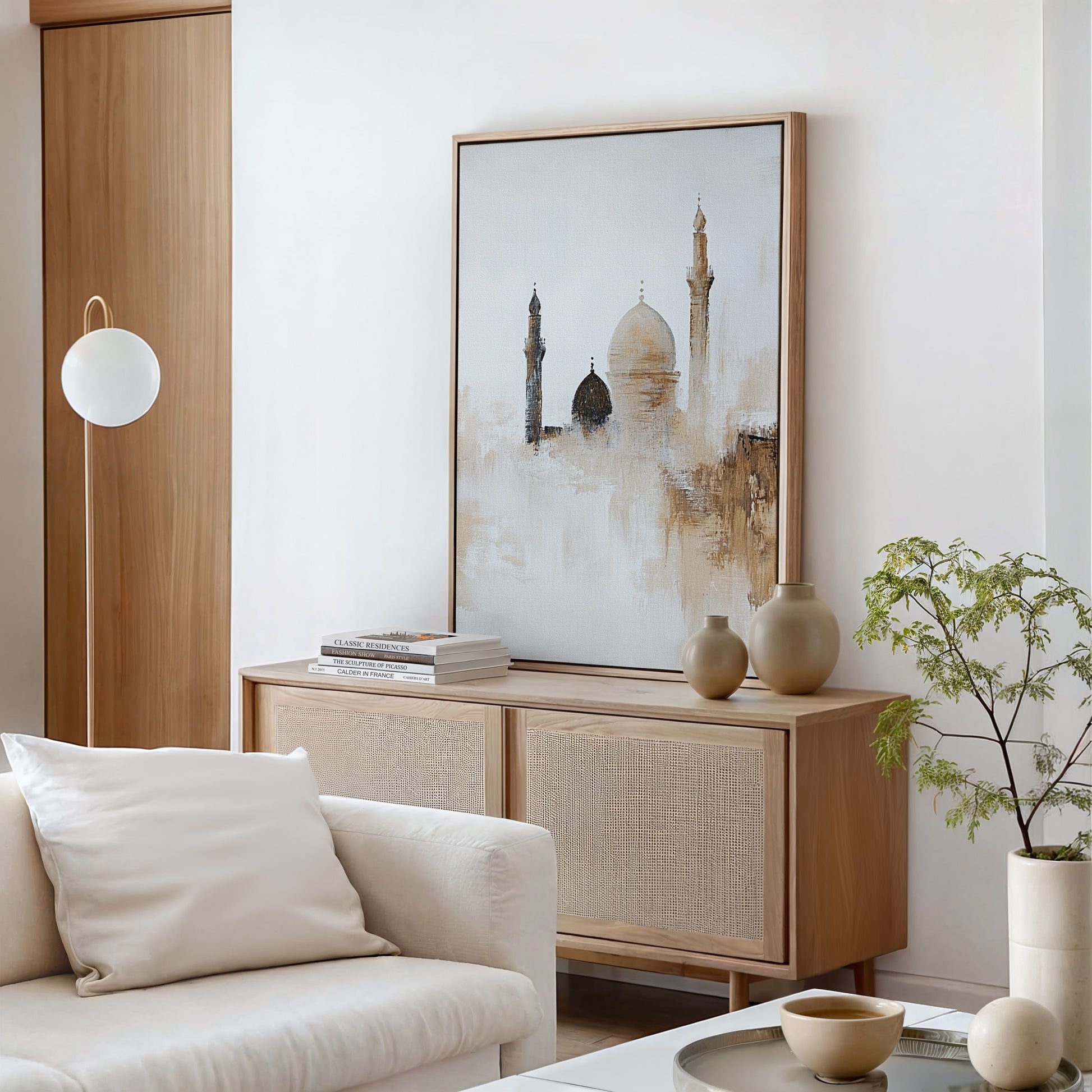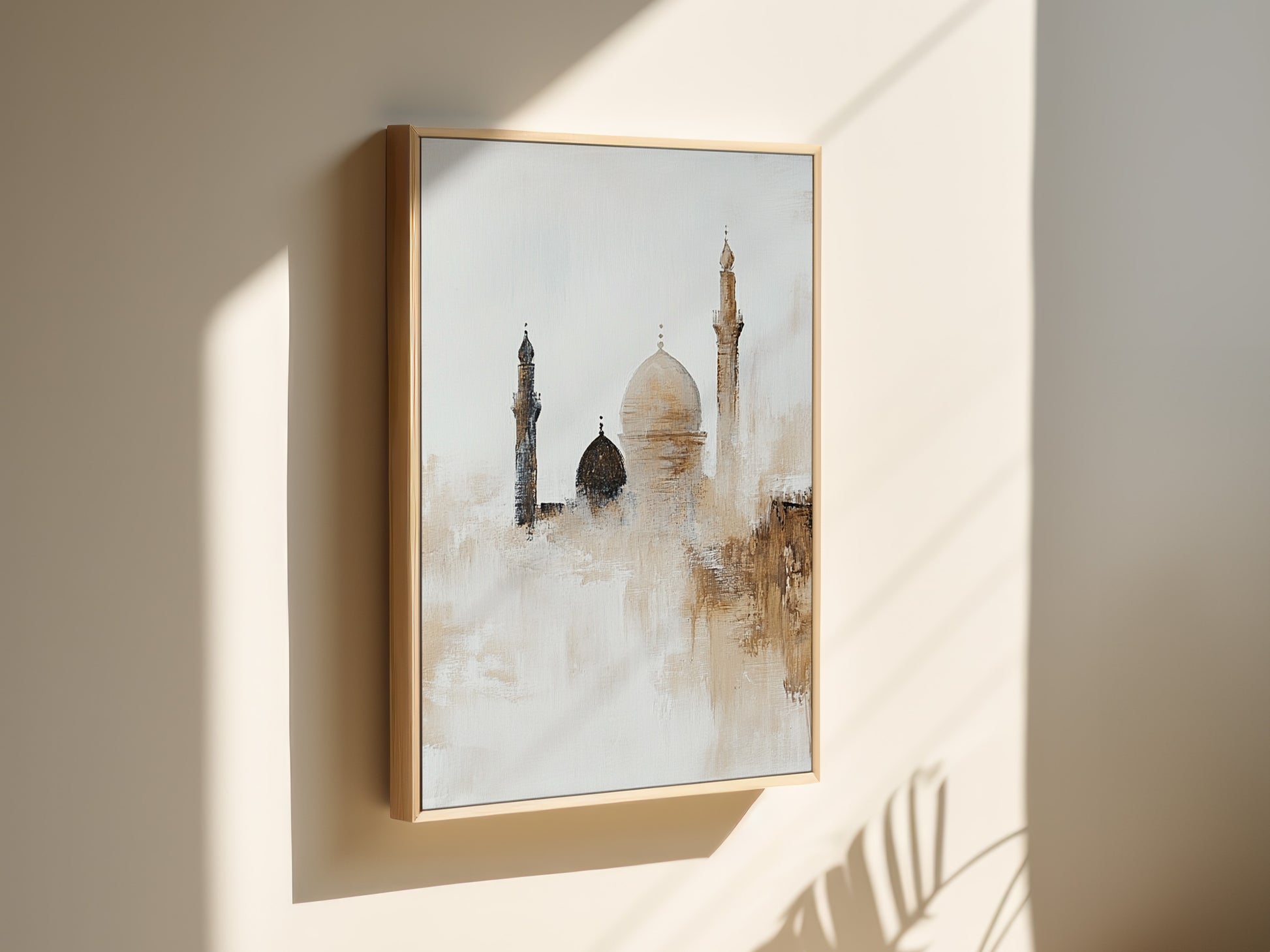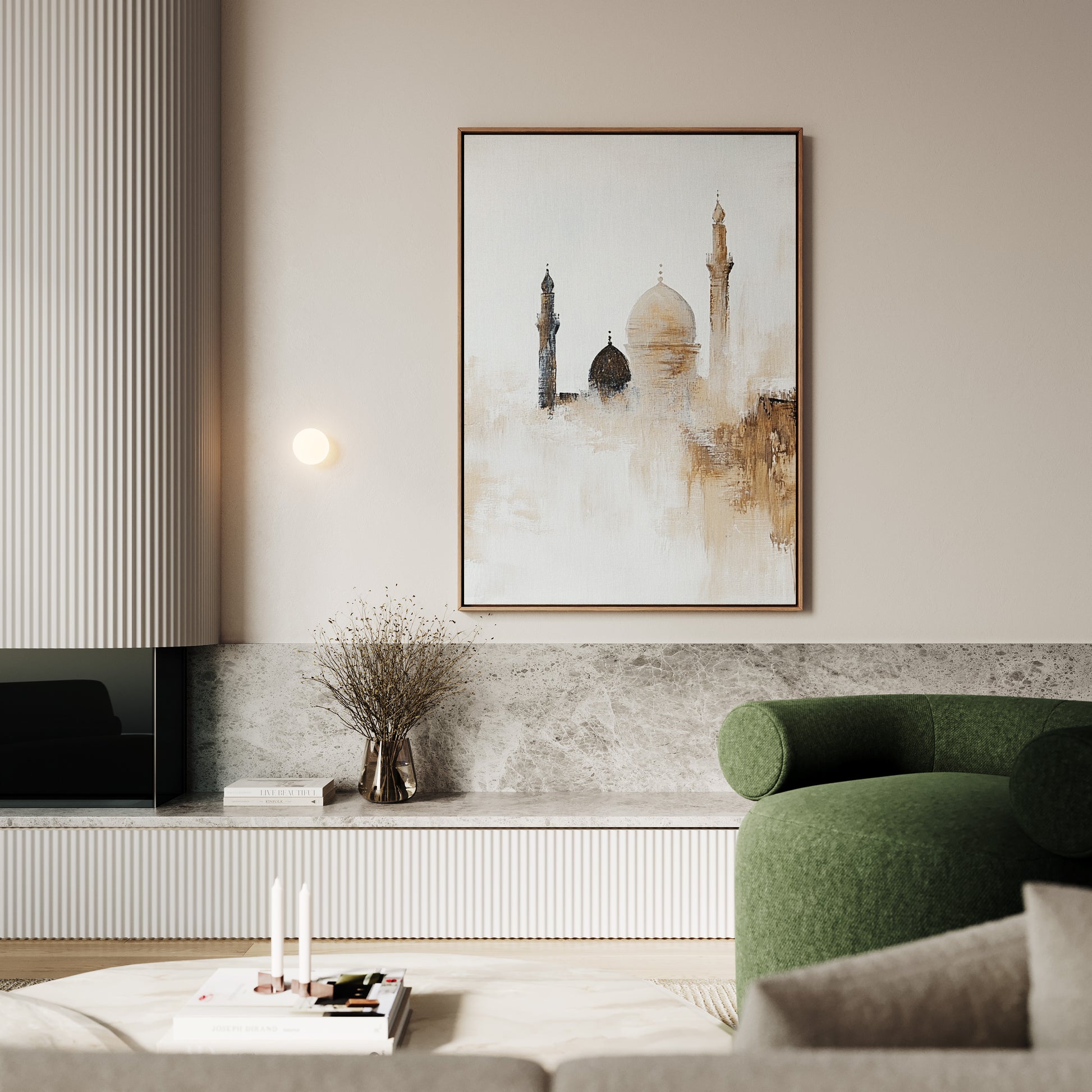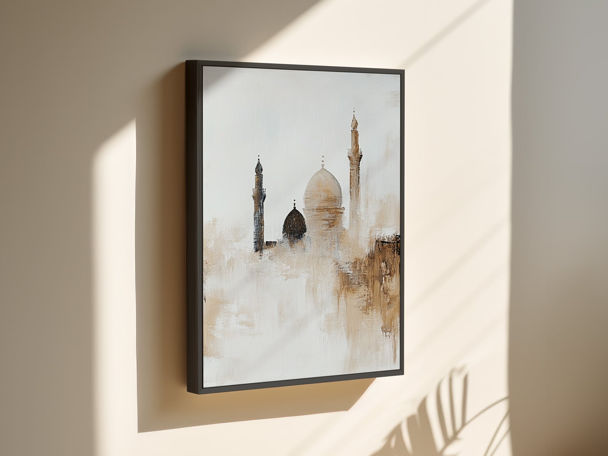 Desert Mirage blends rich earthy browns with soft neutrals to create a warm, atmospheric abstract skyline inspired by traditional Islamic architecture. The domes and minarets rise like silhouettes at dusk, adding a sense of mystery and depth. The textured brushwork gives the piece a luxurious, artistic character.