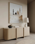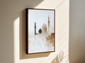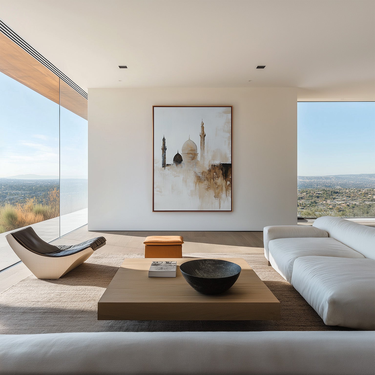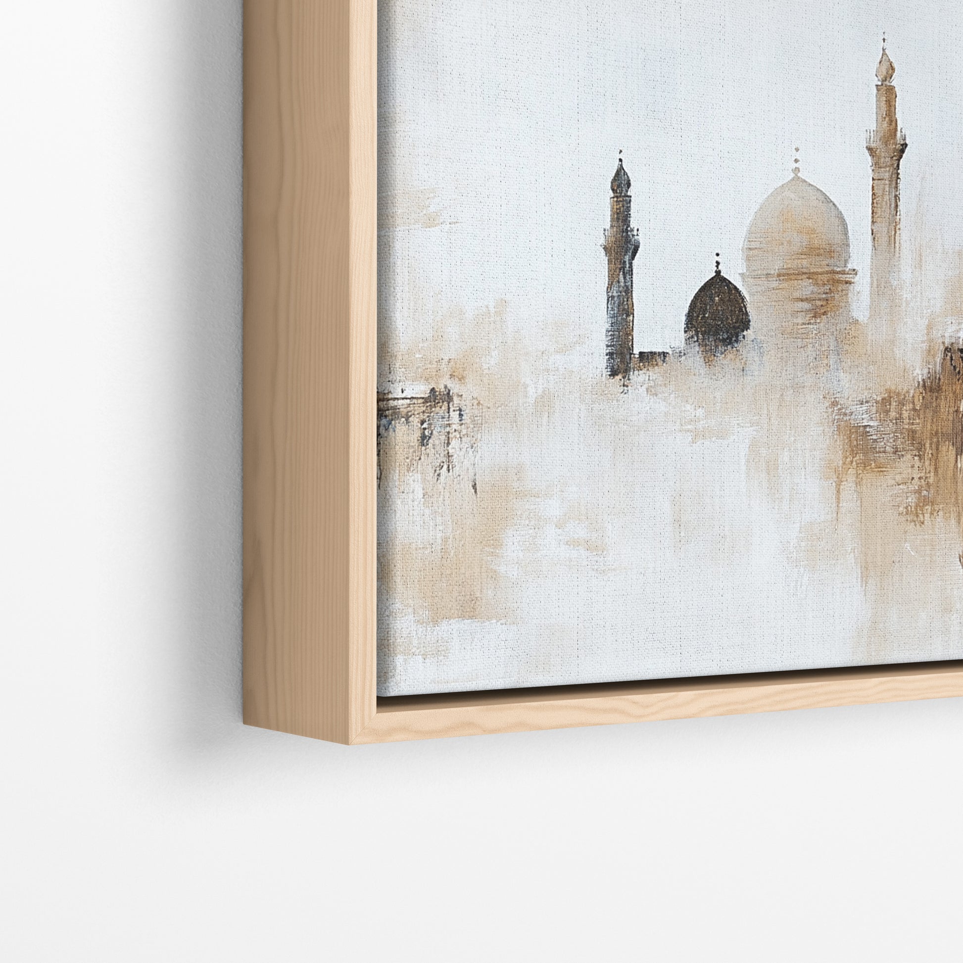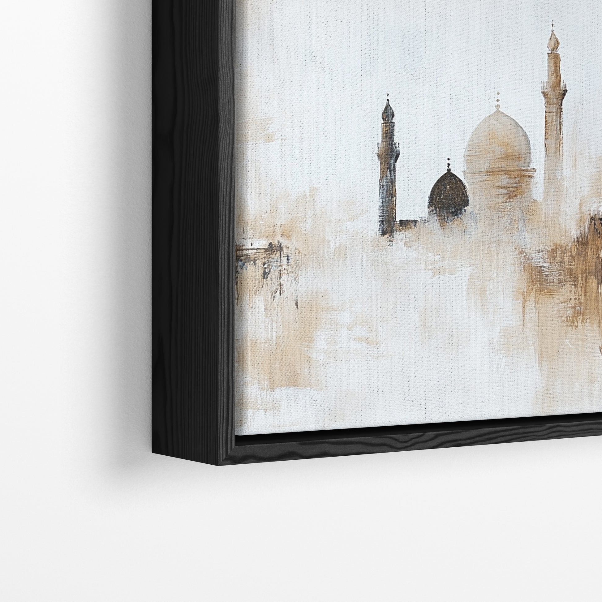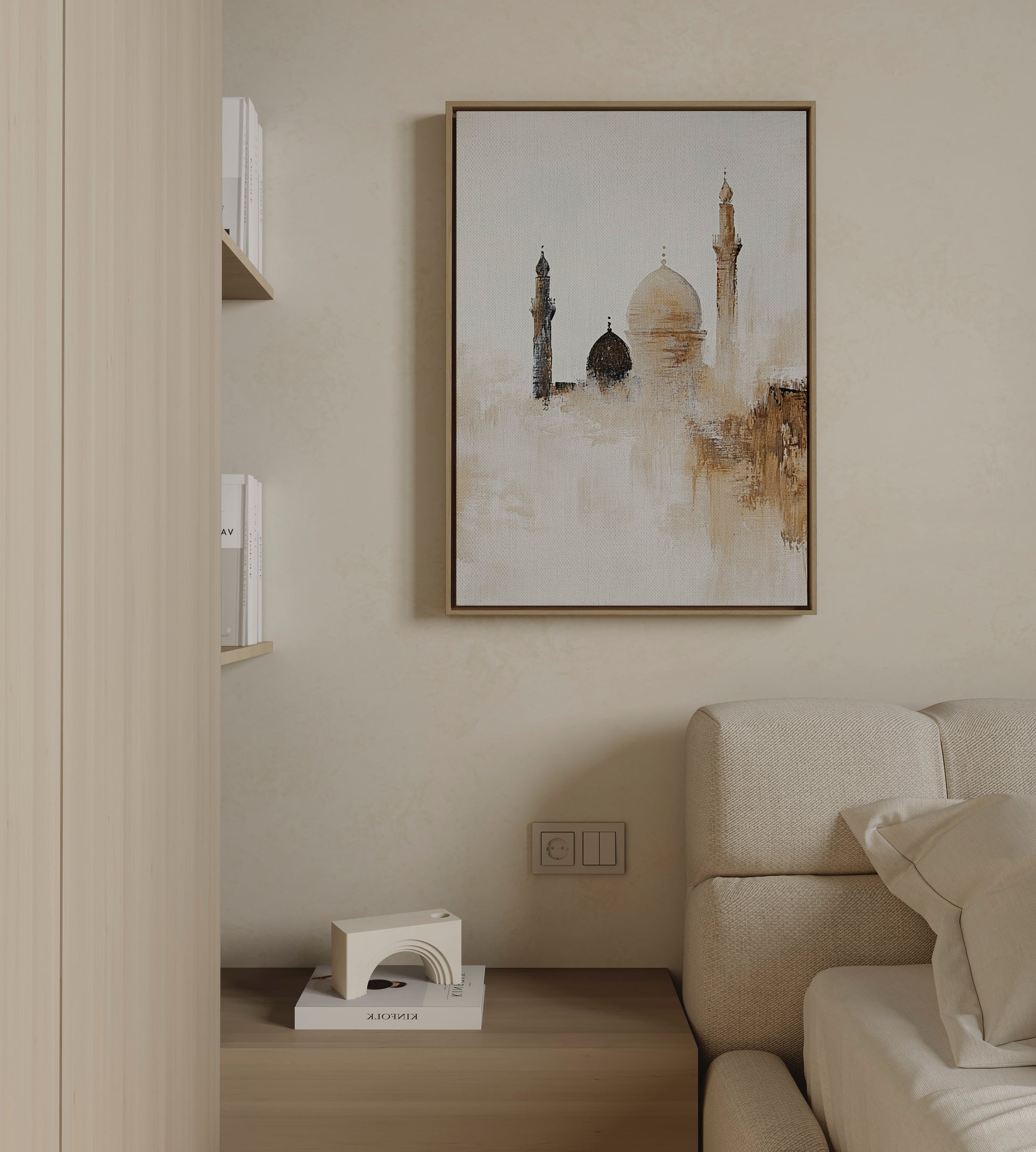 Desert Mirage blends rich earthy browns with soft neutrals to create a warm, atmospheric abstract skyline inspired by traditional Islamic architecture. The domes and minarets rise like silhouettes at dusk, adding a sense of mystery and depth. The textured brushwork gives the piece a luxurious, artistic character.