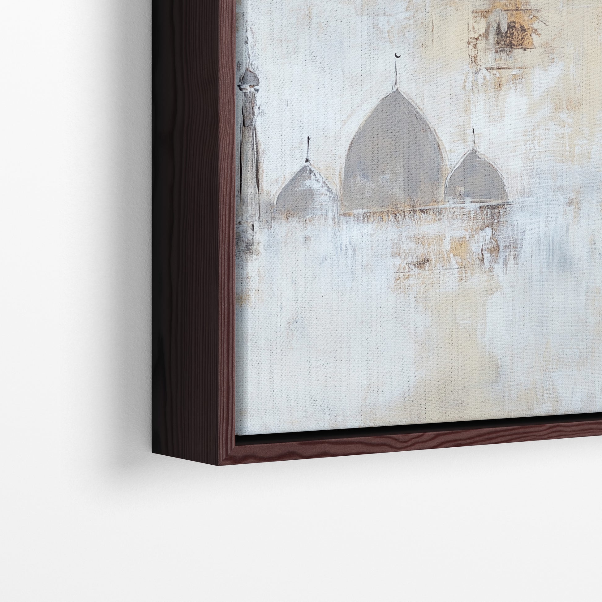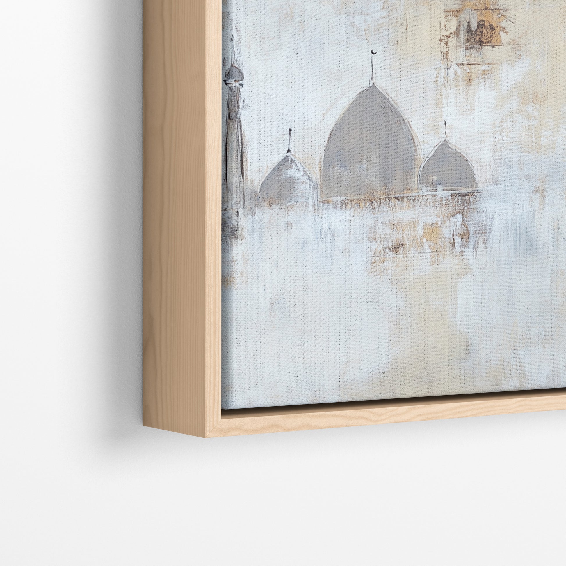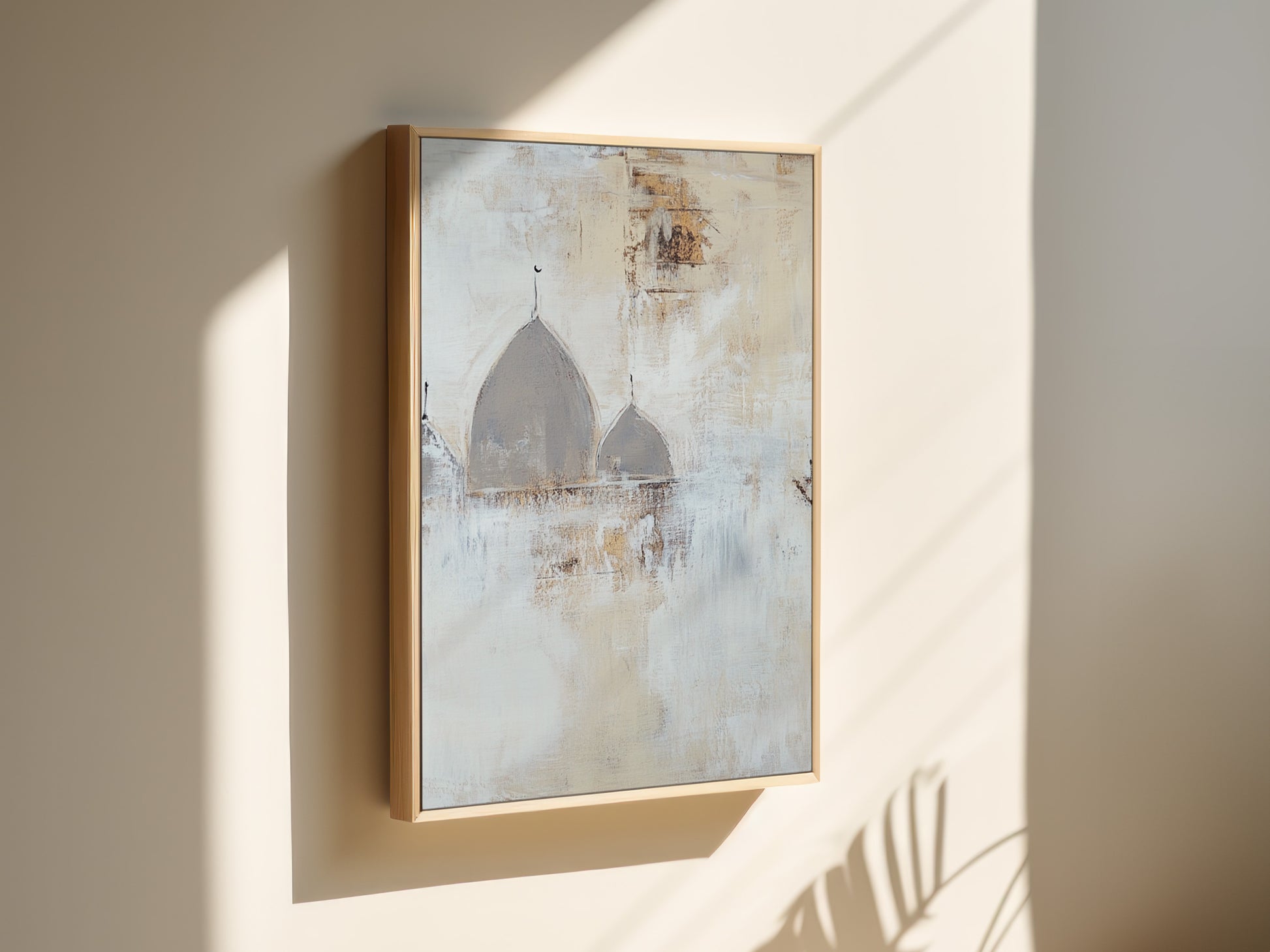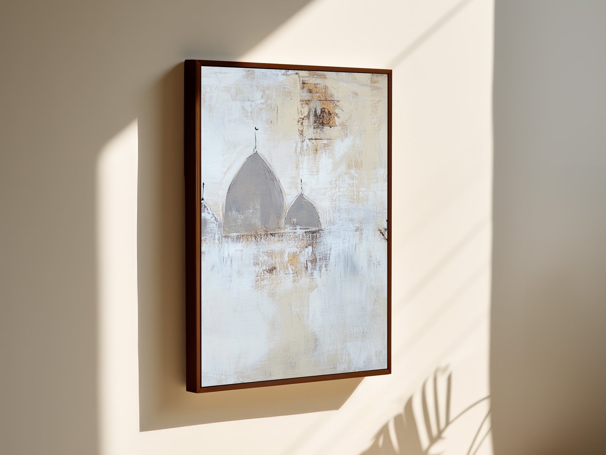 Bring a sense of calm and refined elegance into your home with Eternal Serenity, a softly toned abstract mosque composition. Gentle neutral shades blend into layered textures, creating a dreamlike skyline that feels both spiritual and modern. The subtle domes and minarets appear as though emerging from a warm haze, adding depth without overpowering your space.