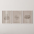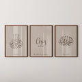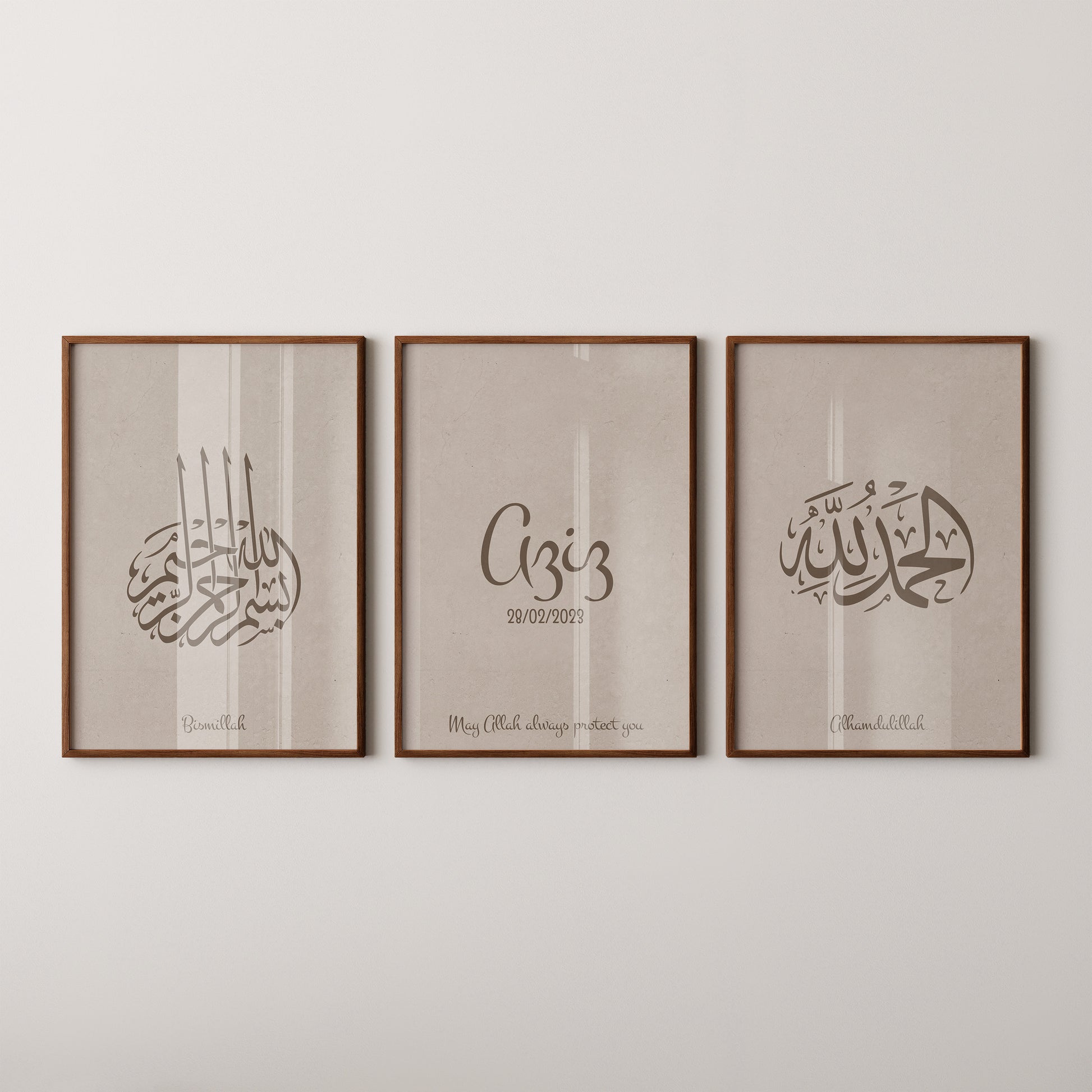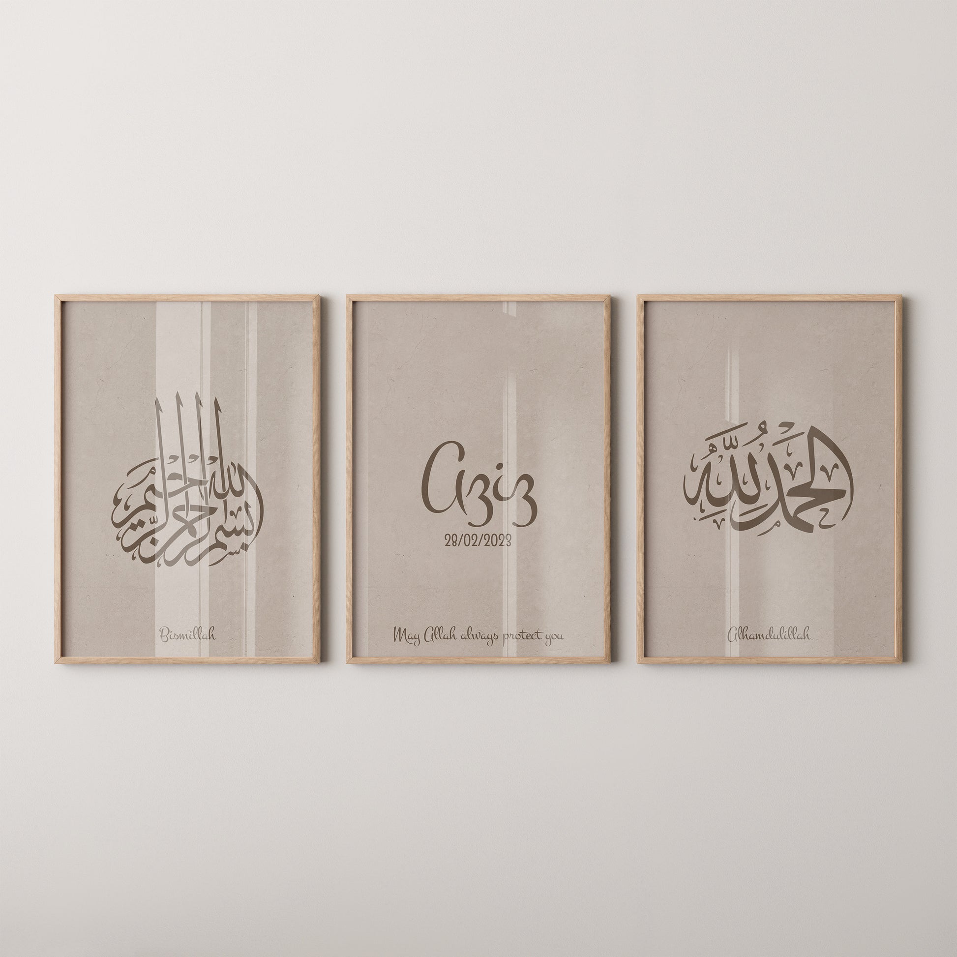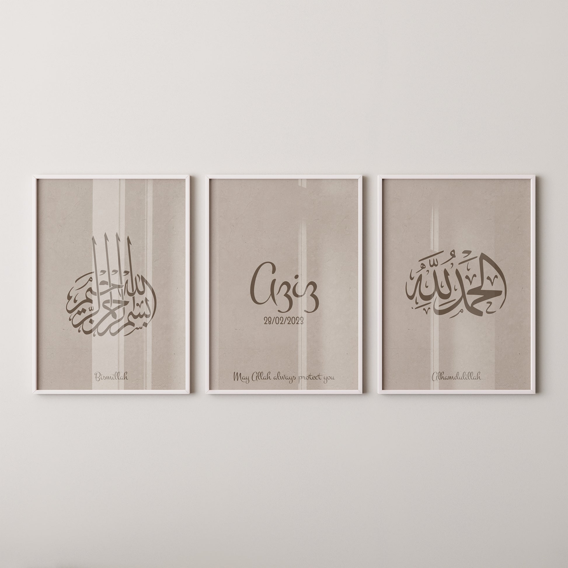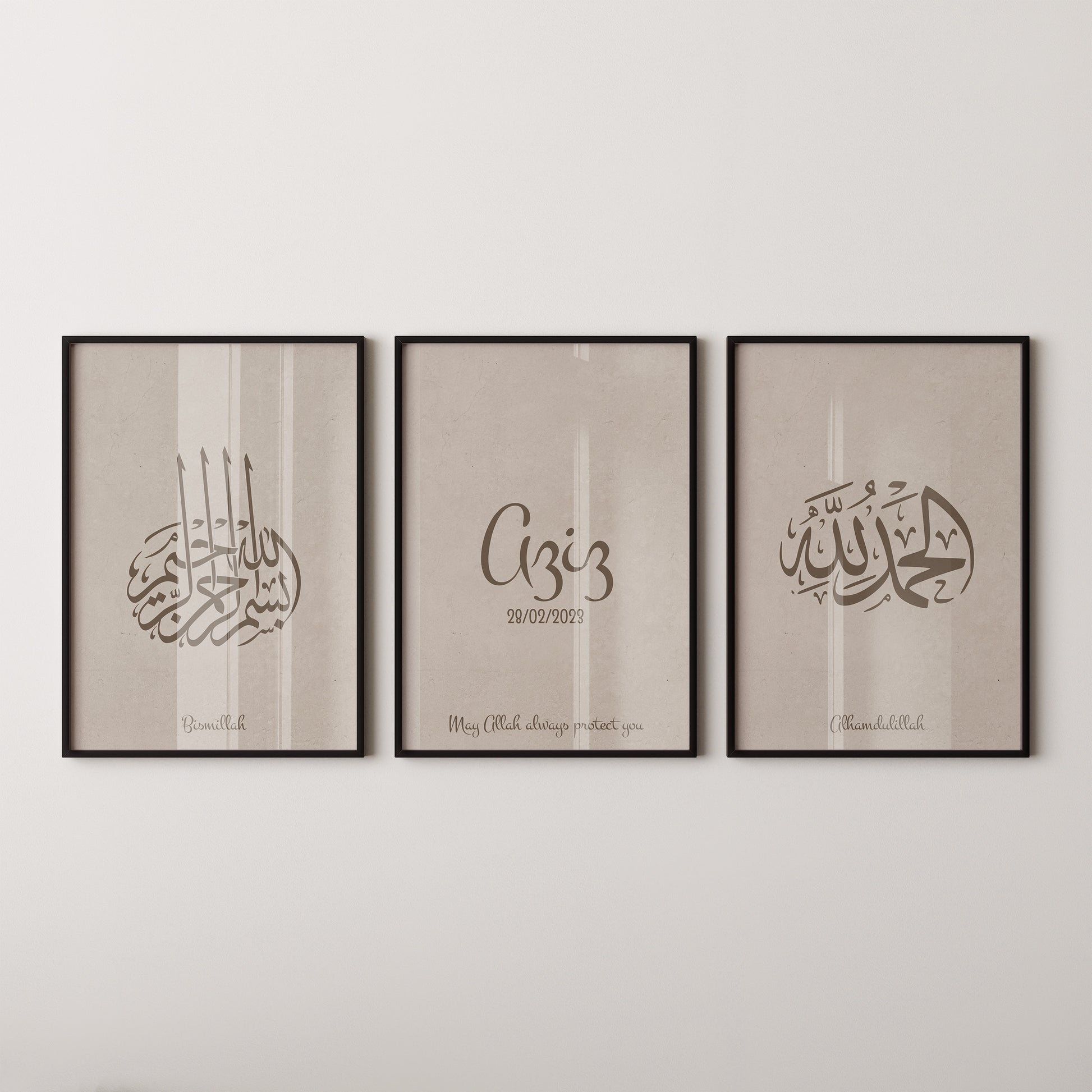 This timeless collection features the sacred phrases “Bismillah” and “Alhamdulillah” in refined Arabic calligraphy, paired with a customizable poster where you can add your baby’s name and birth date. The warm taupe palette blends effortlessly with contemporary interiors, making the artwork a serene and stylish addition to your home.